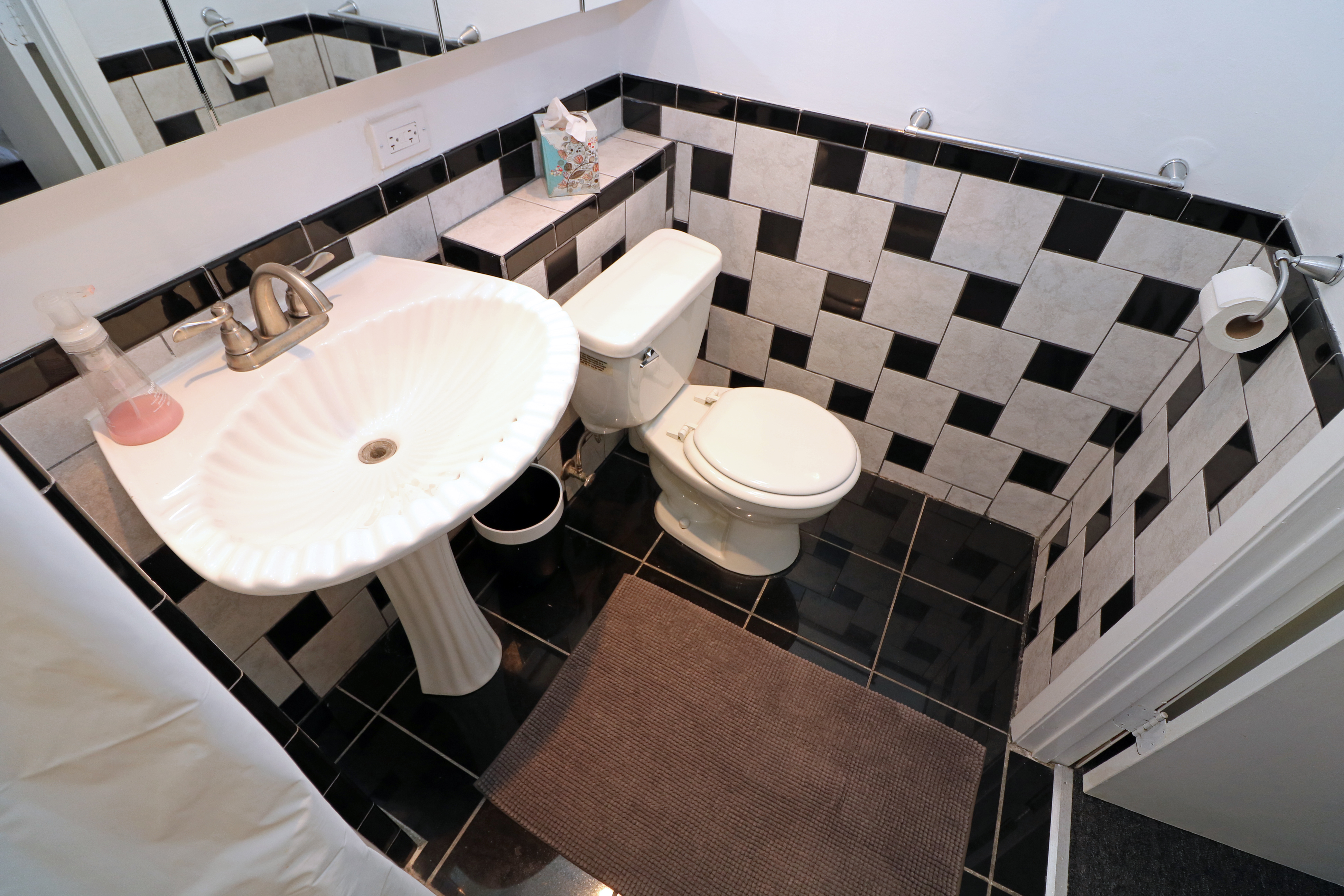 Bathroom Nr 1 with bathtub and shower combo. Glass partition wall installed for bath tub (not shown on this picture)