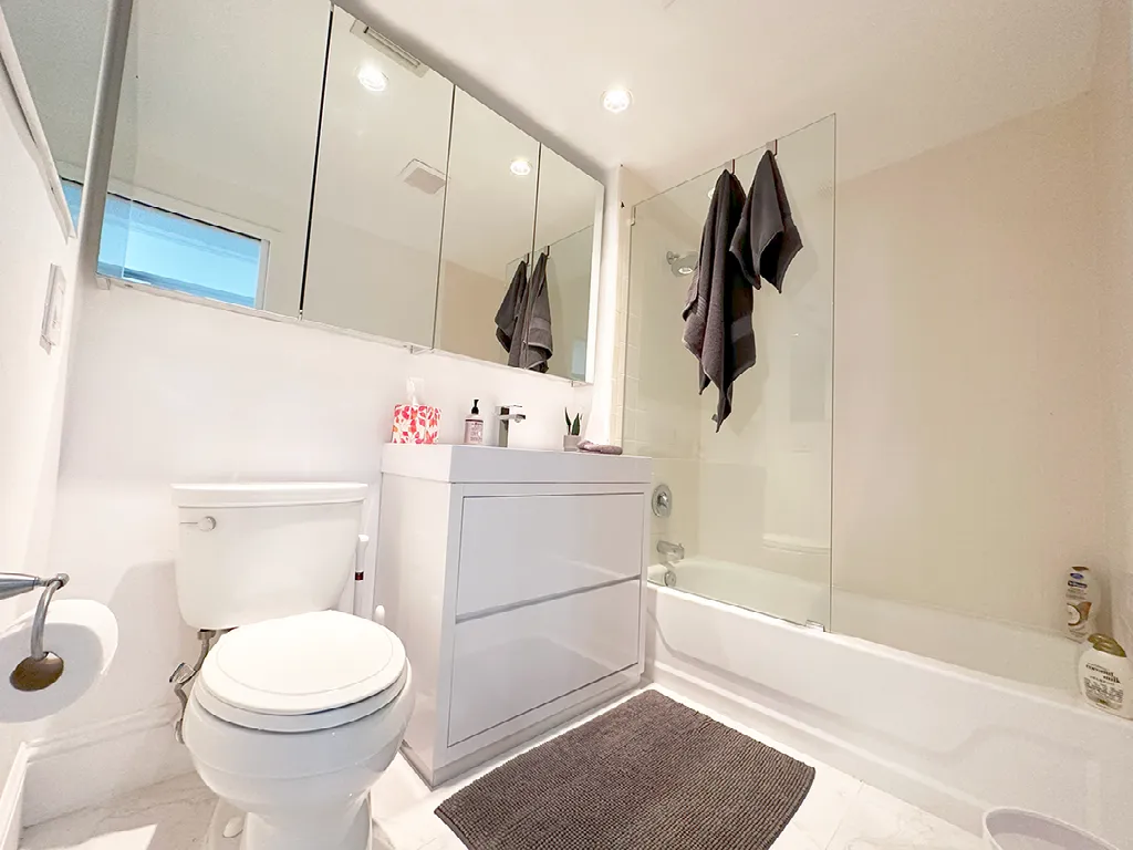 Bathrooms with modern vanities, shower, bath tub and double mirror wall cabinets